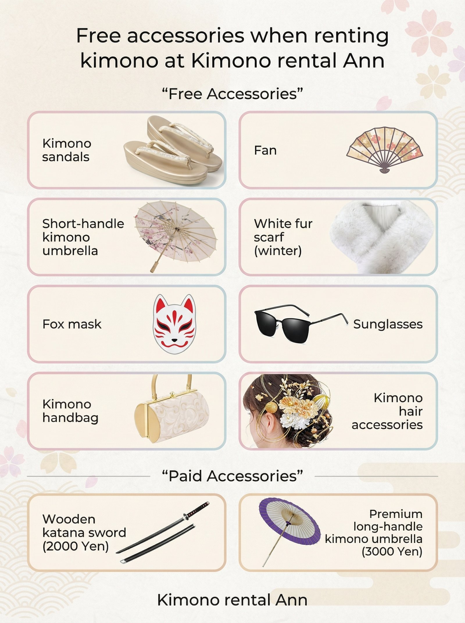 • Kimono rentals are for same-day use and must be returned by 6:00 PM. If you need to return it later, please contact us in advance.